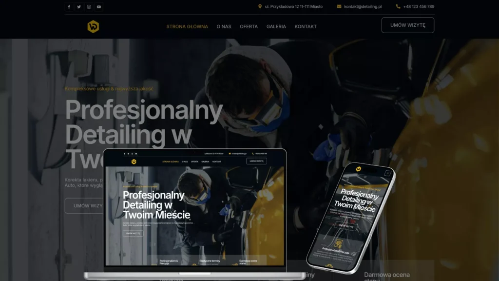 Strona internetowa dla studia detailingu powinna od razu budować zaufanie i prowadzić klienta do kontaktu. W tej branży liczy się efekt wizualny, precyzja i jasny zakres usługi — dlatego układ strony jest nastawiony na szybkie pokazanie oferty, przykładów realizacji oraz prostą rezerwację terminu. Klient ma w kilka sekund zrozumieć, czy robisz korektę lakieru, aplikację powłok ochronnych i detailing wnętrza, a potem bez szukania informacji przejść do formularza lub zadzwonić. Projekt jest przygotowany jako strona multipage, dzięki czemu możesz czytelnie rozdzielić usługi, opisać pakiety oraz odpowiedzieć na najczęstsze pytania. Sekcje z korzyściami i opiniami pomagają przełamać typowe obiekcje („czy to ma sens?”, „ile to trwa?”, „czy efekt będzie widoczny?”), a galeria realizacji pokazuje jakość pracy bez zbędnego tłumaczenia. Ważnym elementem jest też kontakt — widoczny numer telefonu, e‑mail oraz formularz, który zbiera konkretne informacje i ułatwia szybką wycenę. To rozwiązanie sprawdzi się zarówno dla jednoosobowego studia detailingu, jak i większego zespołu, który chce uporządkować ofertę i regularnie pozyskiwać zapytania z internetu. Wdrożenie gotowego projektu zajmuje zwykle 2–5 dni roboczych i obejmuje dopasowanie treści oraz danych firmy. Dzięki temu dostajesz gotową, estetyczną stronę, która wygląda profesjonalnie i jest zbudowana pod realny cel: więcej telefonów, wiadomości i rezerwacji terminów.