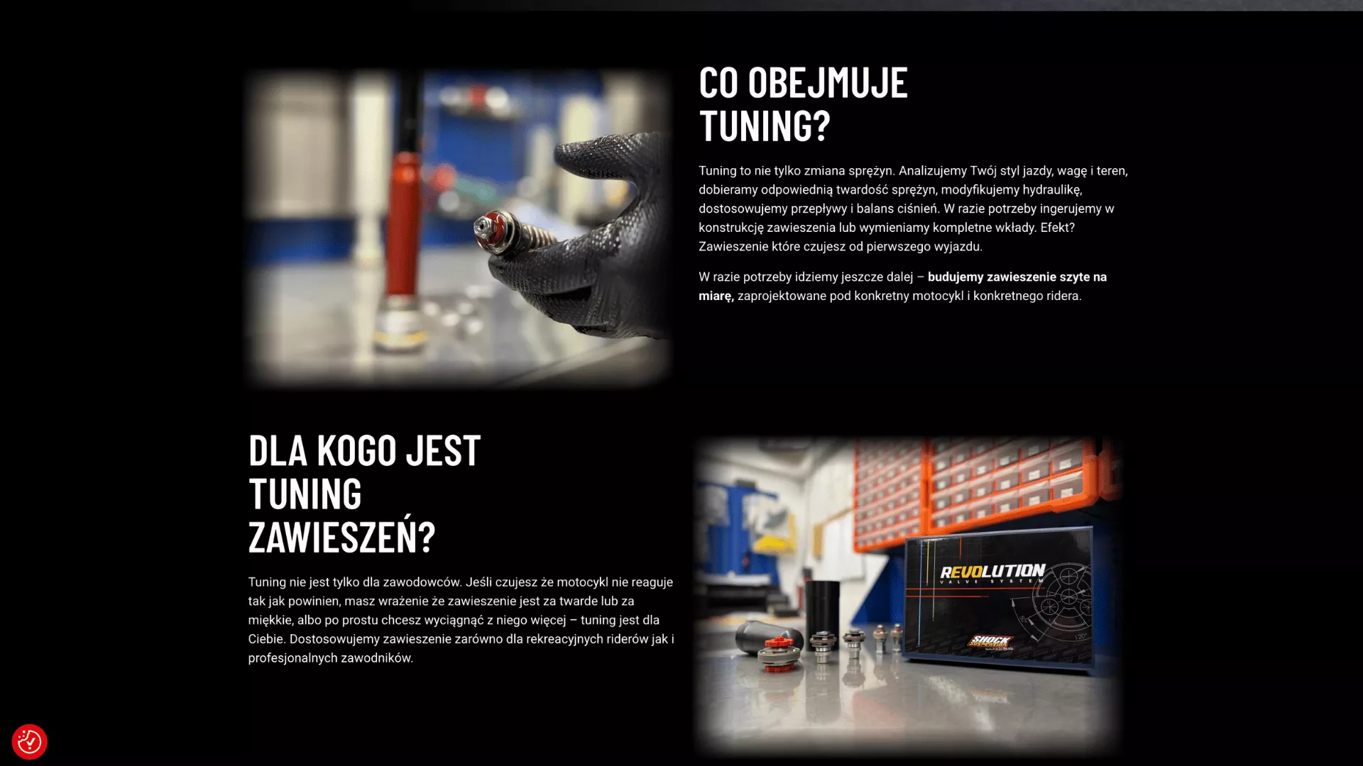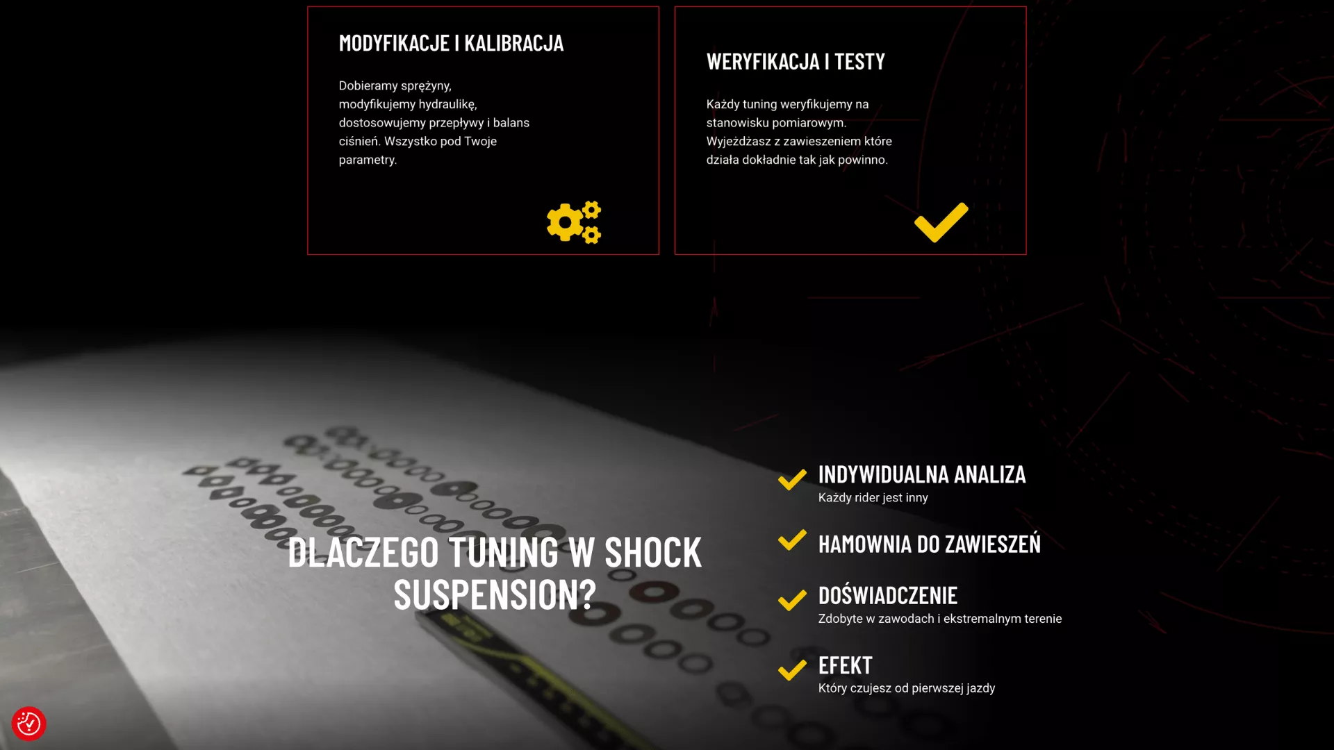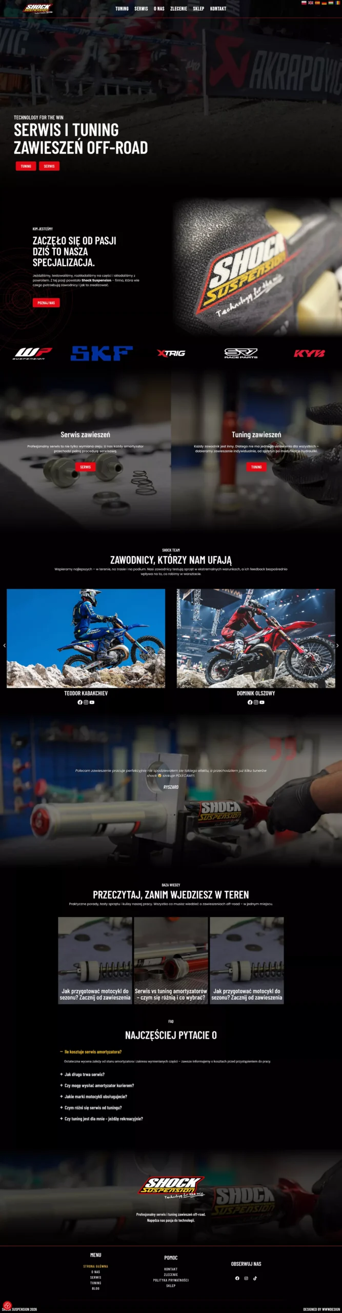 Celem tej realizacji było stworzenie strony, która jasno komunikuje specjalizację Shock Suspension i ułatwia klientom szybkie zlecenie serwisu lub tuningu. Zaprojektowałem strukturę multipage z czytelnym podziałem na kluczowe obszary (serwis, tuning, informacje o firmie i kontakt), dzięki czemu użytkownik od razu trafia do interesującej go usługi bez przeklikiwania się przez chaos treści.Wdrożenie obejmowało również elementy stricte „pod proces”: mapę z wyborem oddziału oraz formularz zlecenia naprawy/tuningu zawieszenia, który zbiera konkretne dane i usprawnia obsługę zapytań. Dodatkowo strona została uzupełniona o sekcje budujące wiarygodność (m.in. zespół/zawodnicy, baza wiedzy, FAQ), co pomaga przełamywać obiekcje i zwiększa liczbę kontaktów. Efekt to nowoczesna, dopracowana strona, która wspiera sprzedaż i organizuje komunikację z klientami.