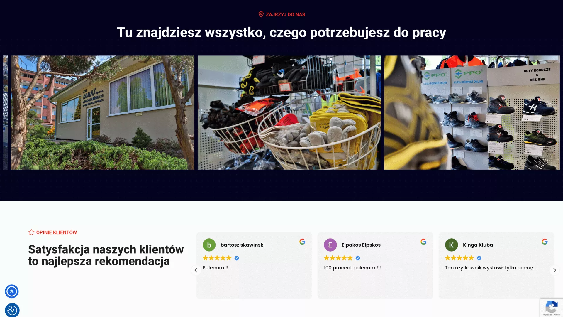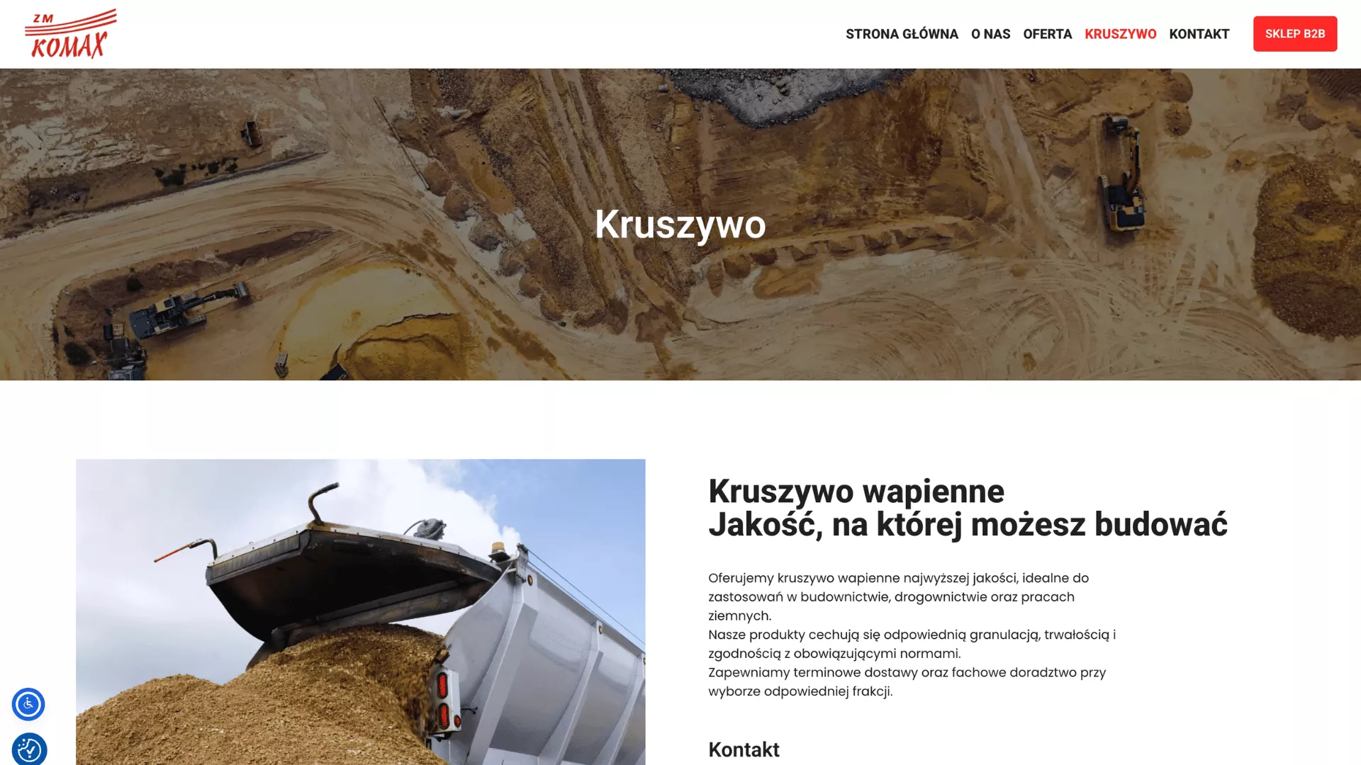 W ramach tej realizacji wykonałem modernizację strony KOMAX BHP — firmy działającej od 1992 roku w branży bezpieczeństwa pracy i dostaw kruszyw. Celem było odświeżenie wizerunku i ułatwienie klientom B2B znalezienia potrzebnych produktów.Strona została przebudowana wokół czterech głównych filarów: artykułów BHP (obuwie ochronne, odzież, rękawice, środki czystości), kruszyw budowlanych, doradztwa i wsparcia, oraz zaufania wynikającego z 30-letniej historii firmy. Dodałem mocne sekcje CTA (telefon, email, formularz), galerię zdjęć ze sklepu, oraz wyraźne komunikaty o jakości i terminowości dostaw.Efekt: nowoczesna, profesjonalna strona, która buduje wiarygodność, ułatwia przeglądanie oferty i skraca drogę do kontaktu — kluczowe dla sprzedaży B2B.